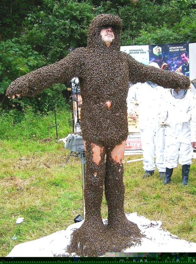 A swarm is like a human democracy: we listen to candidates promote themselves, then vote for one. A swarm does the same by voting on nesting sites promoted by scouts. Scientists call a honey bee swarm ‘a cognitive entity’: which means it can think. Philip McCabe got swarmed by 200 000 bees to raise money for the charity Bees For Development. (Photo by Michael Maunsell).